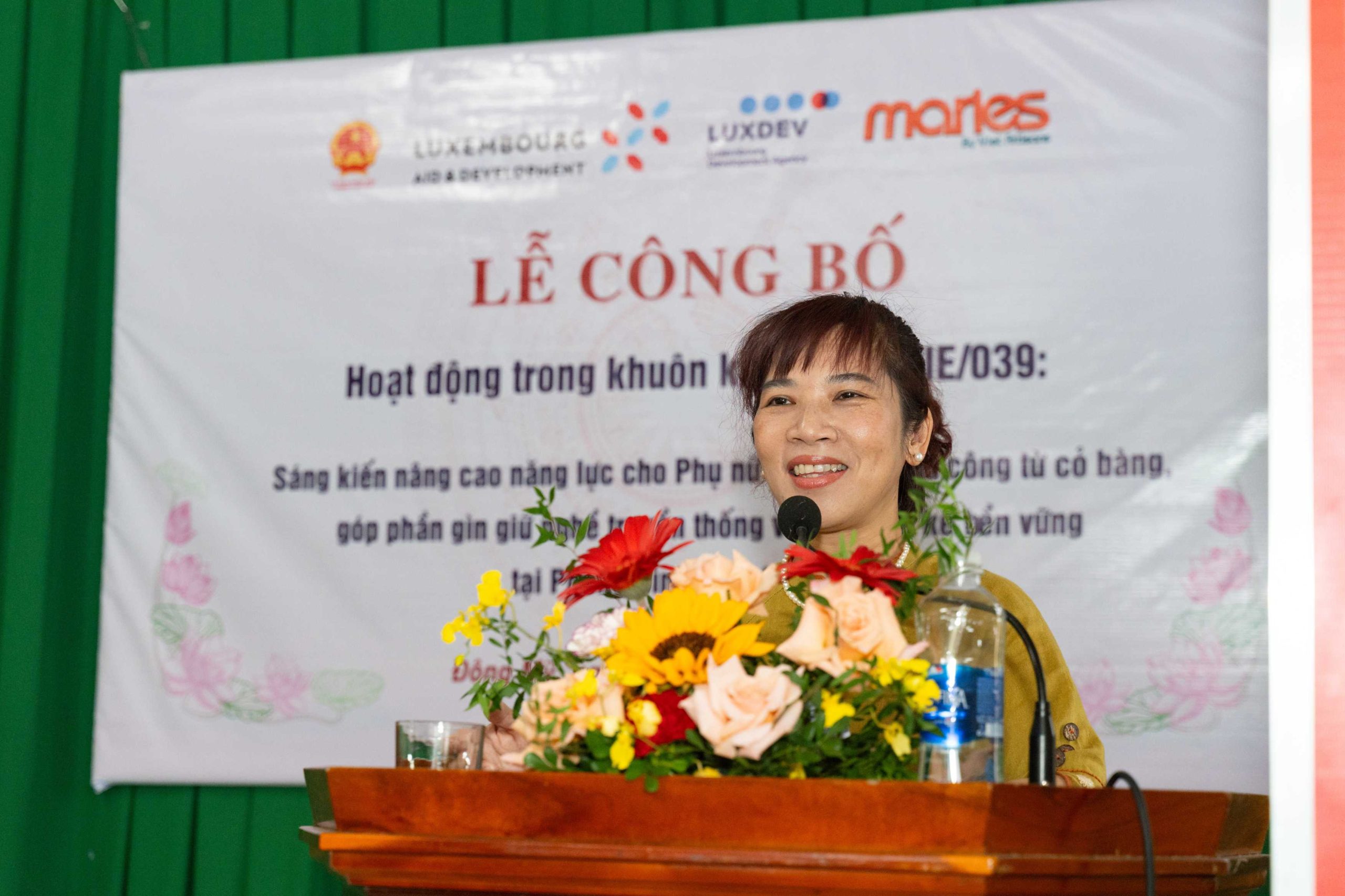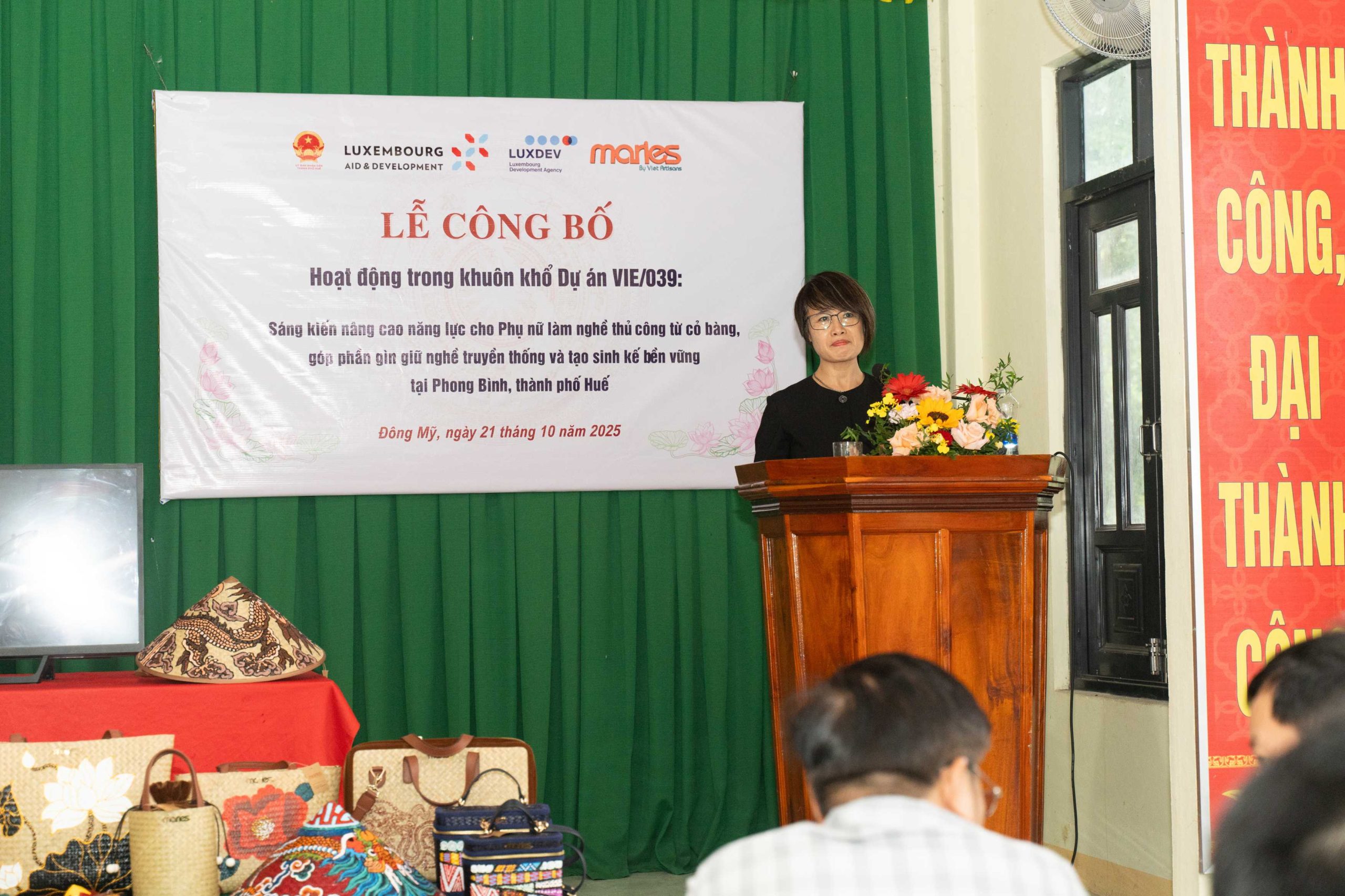 Buổi lễ diễn ra trong không khí ấm áp, gần gũi nhưng trang trọng, với sự tham dự của đại diện Cơ quan Hợp tác Phát triển Luxembourg (LuxDev), lãnh đạo UBND phường Phong Dinh, Ban quản lý các thôn, cùng hơn 70 đại biểu, hộ dân và học viên đến từ làng nghề Đông Mỹ và các vùng lân cận. Sự kiện đánh dấu bước khởi đầu quan trọng trong hành trình đồng hành cùng cộng đồng phụ nữ nông thôn của Maries, hướng tới mục tiêu phát triển bền vững cho nghề thủ công cỏ bàng – một di sản văn hóa đặc trưng của vùng đất Phong Dinh, Thành phố Huế.