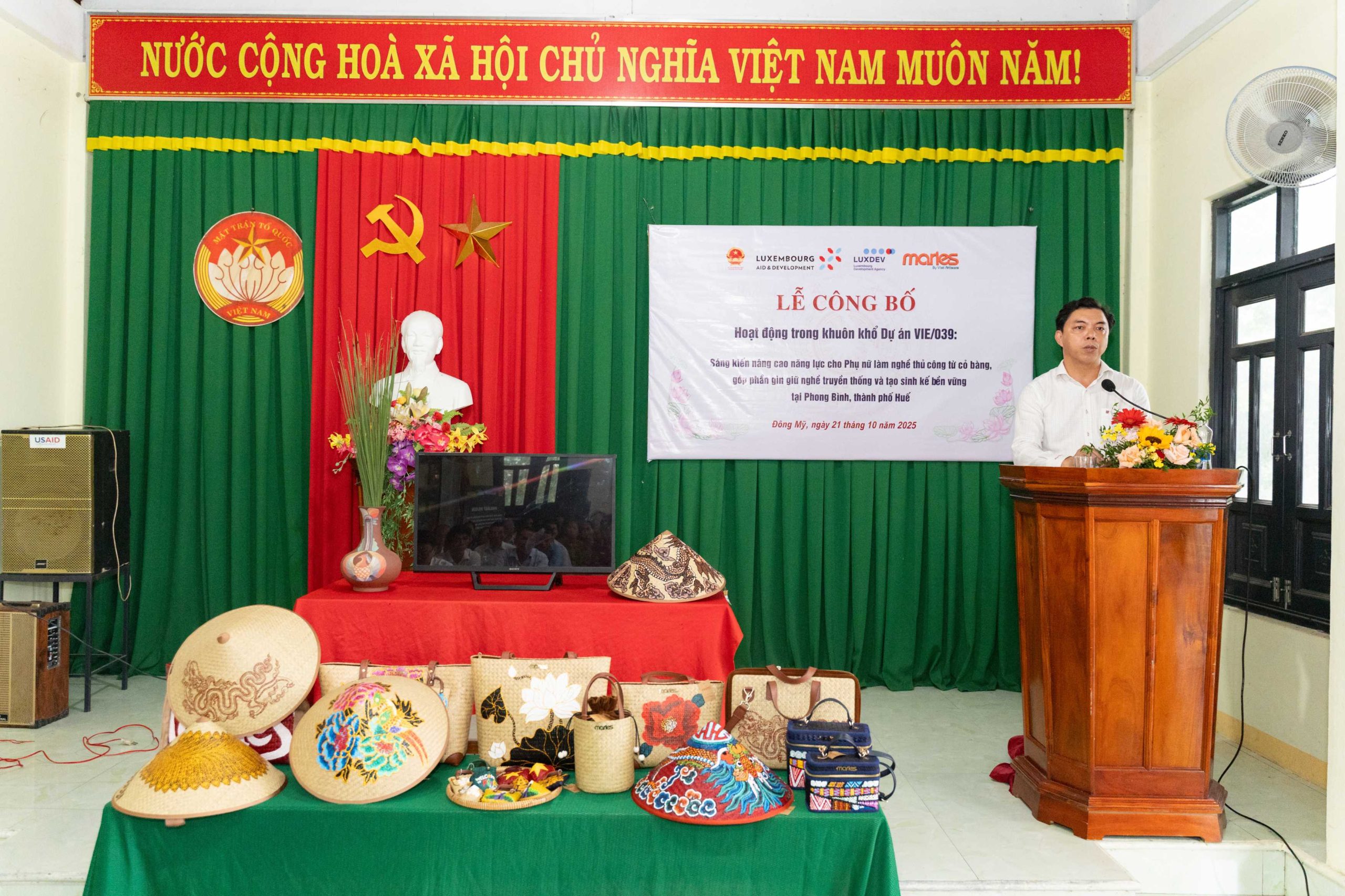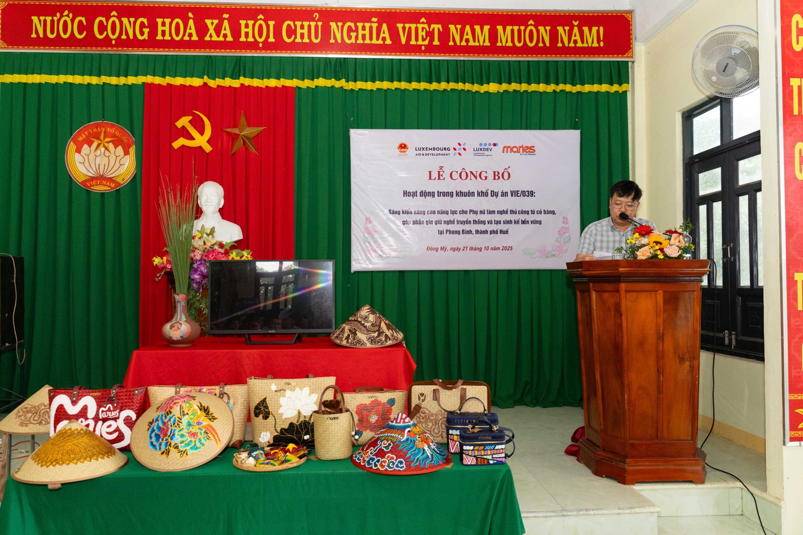 Huế, ngày 21 tháng 10 năm 2025 – Tại Nhà văn hóa Tổ dân phố Đông Mỹ, phường Phong Dinh, thành phố Huế, Công ty TNHH Maries – Cỏ Bàng Xứ Huế phối hợp cùng Ban Quản lý Dự án Luxembourg (LuxDev) tổ chức Lễ công bố hoạt động trong khuôn khổ Dự án VIE/039 với chủ đề “Sáng kiến nâng cao năng lực cho Phụ nữ làm nghề thủ công từ cỏ bàng, góp phần gìn giữ nghề truyền thống và tạo sinh kế bền vững tại Phong Bình (nay là phường Phong Dinh), thành phố Huế.”