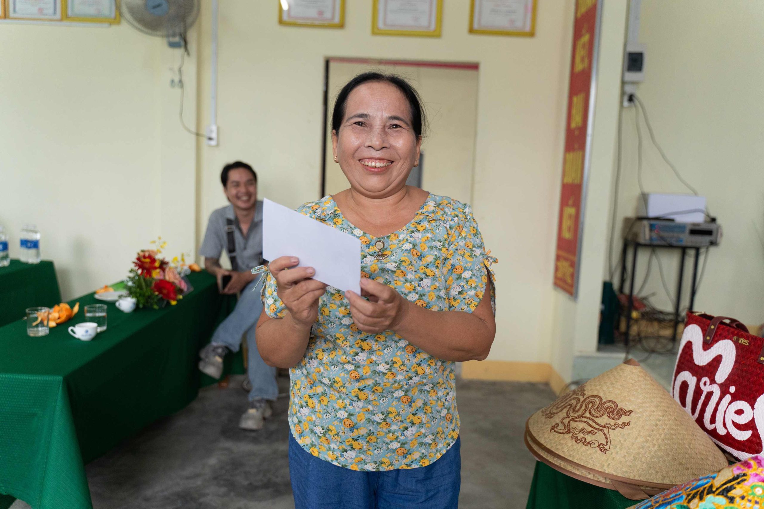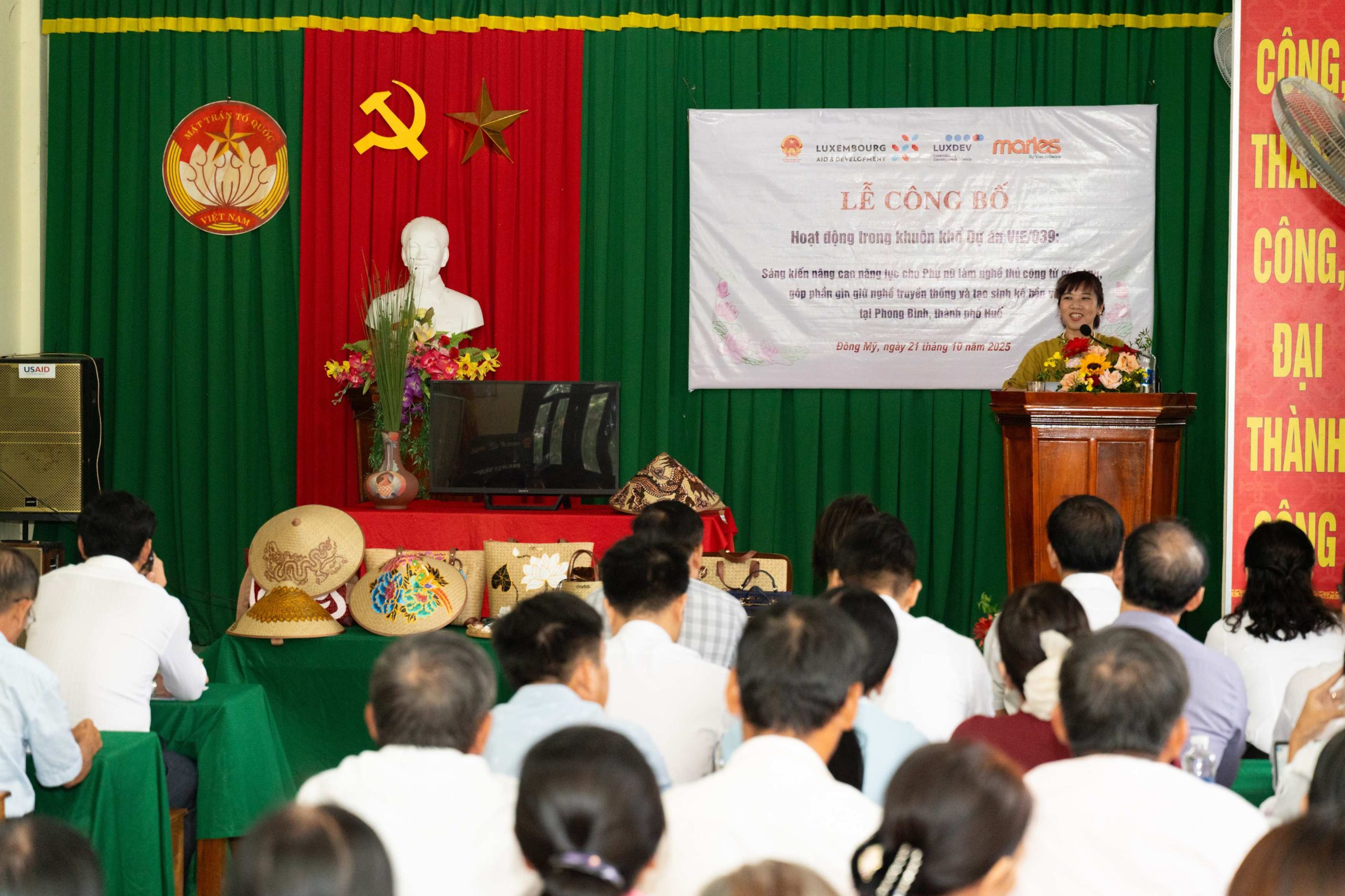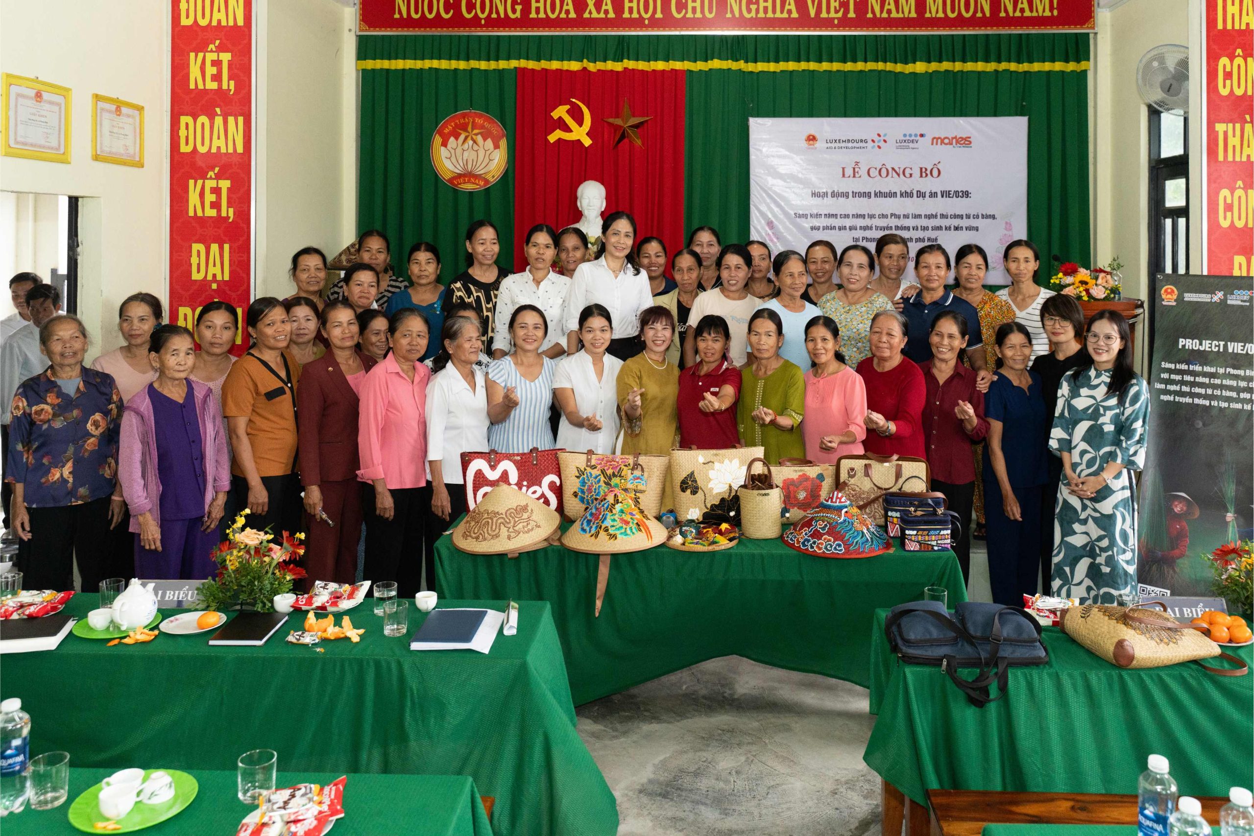 Buổi lễ diễn ra trong không khí ấm áp, gần gũi nhưng trang trọng, với sự tham dự của đại diện Cơ quan Hợp tác Phát triển Luxembourg (LuxDev), lãnh đạo UBND phường Phong Dinh, Ban quản lý các thôn, cùng hơn 70 đại biểu, hộ dân và học viên đến từ làng nghề Đông Mỹ và các vùng lân cận. Sự kiện đánh dấu bước khởi đầu quan trọng trong hành trình đồng hành cùng cộng đồng phụ nữ nông thôn của Maries, hướng tới mục tiêu phát triển bền vững cho nghề thủ công cỏ bàng – một di sản văn hóa đặc trưng của vùng đất Phong Dinh, Thành phố Huế.