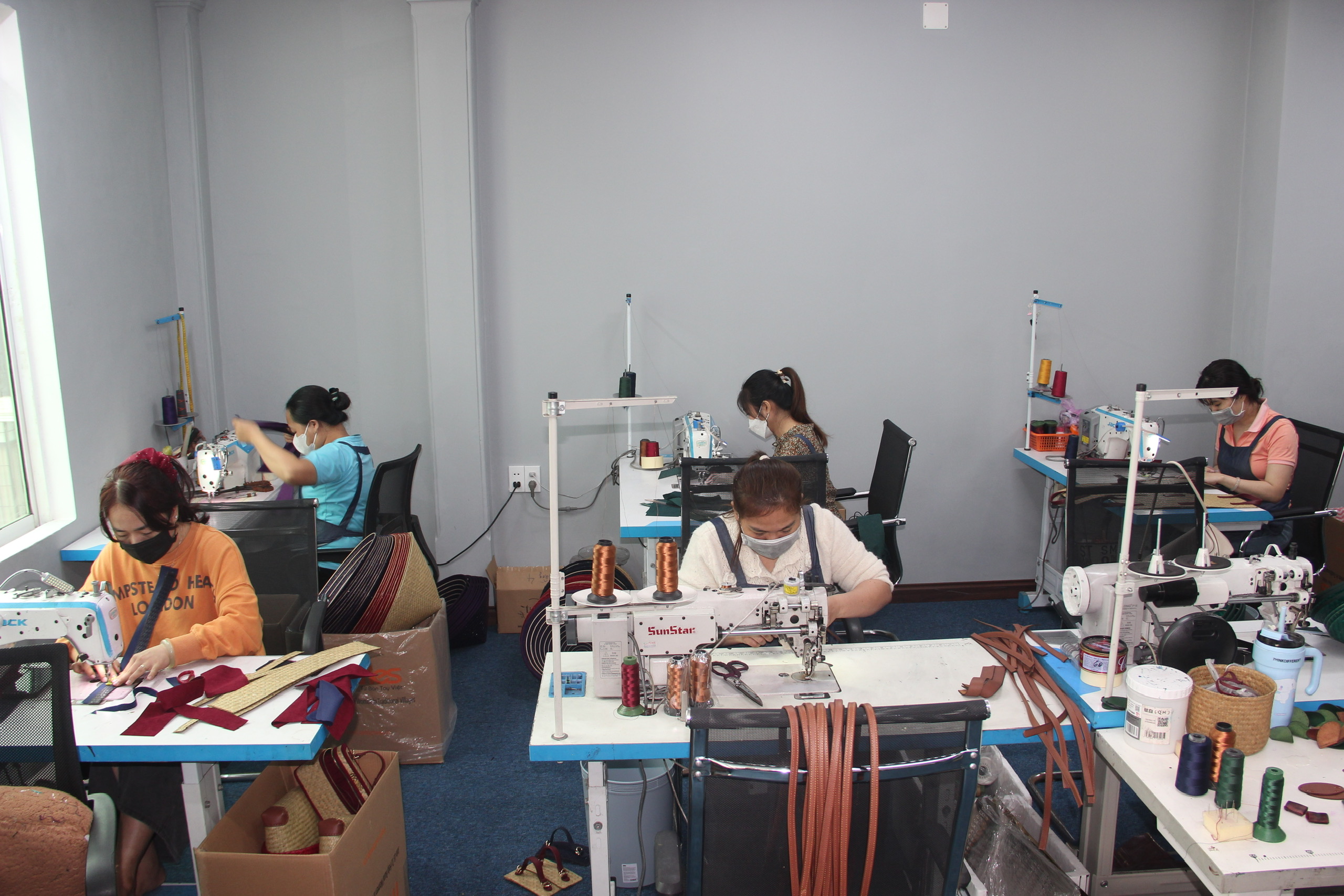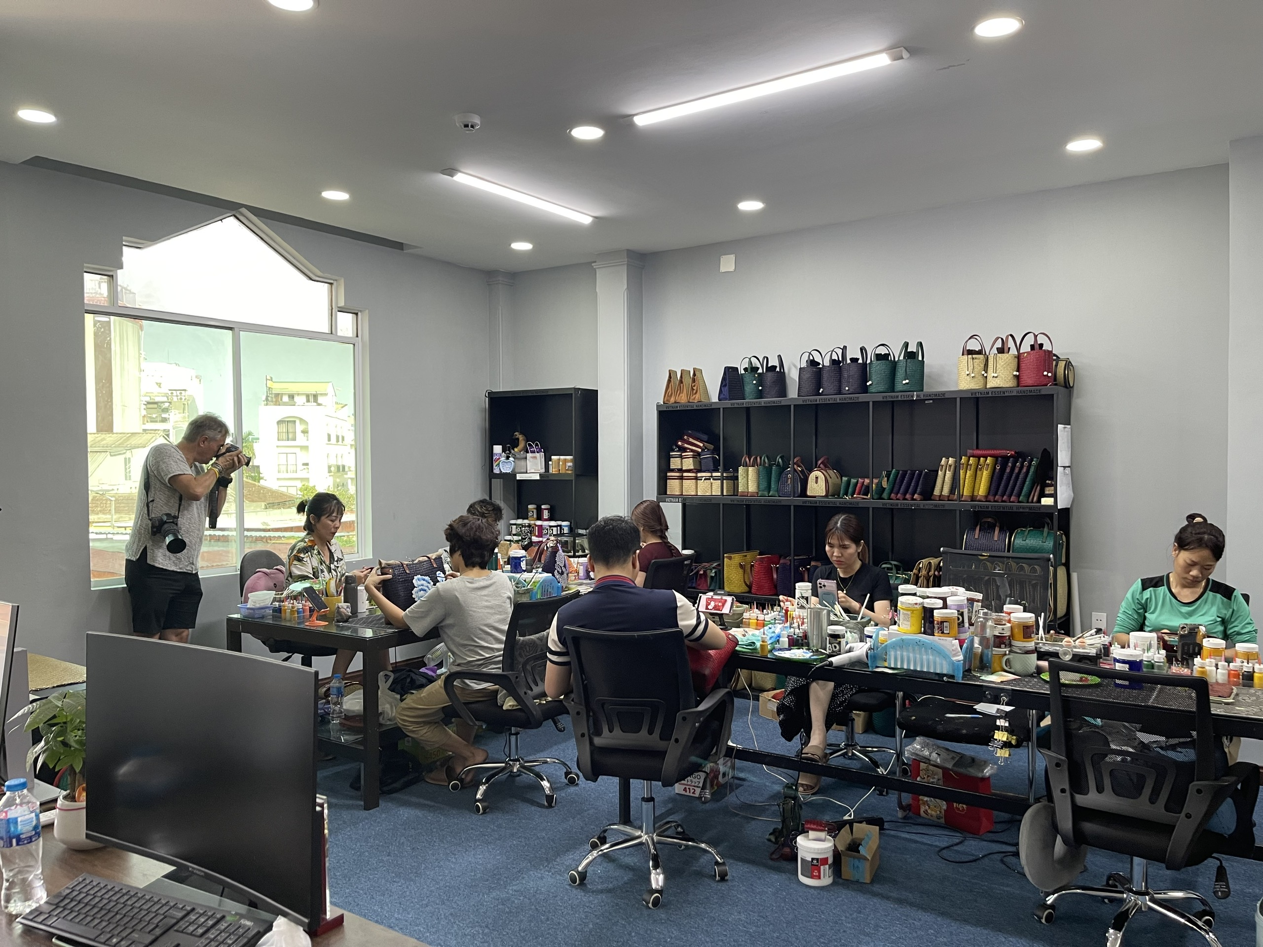 Ở các tầng trên, khách tham quan có thể tận mắt chứng kiến quy trình tạo nên một sản phẩm đồ thủ công mỹ nghệ truyền thống: từ sợi Cỏ Bàng được xử lý, đan tay, may kết cấu đến công đoạn vẽ họa tiết thủ công bằng tay.
