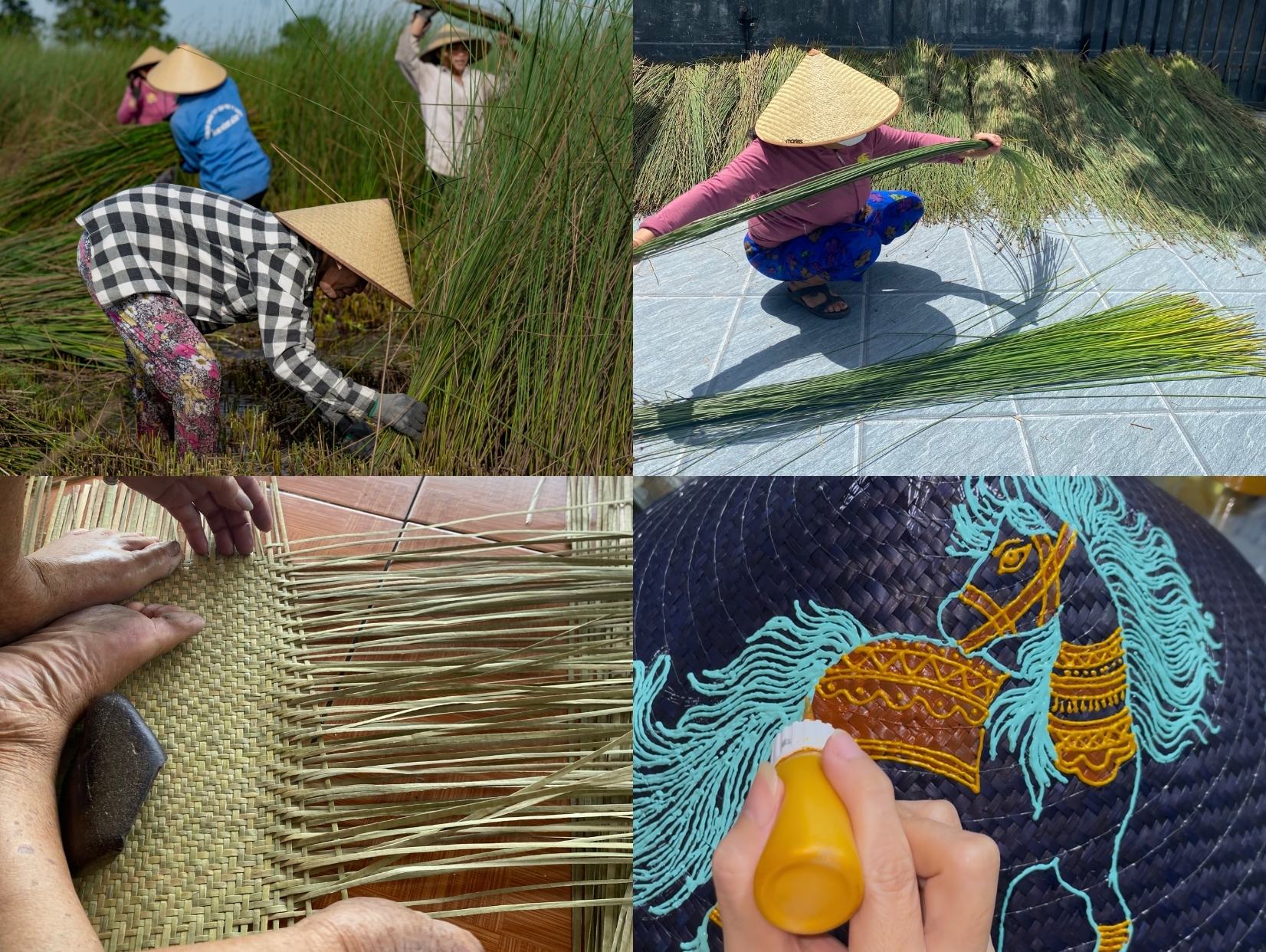 Điều làm nên linh hồn của bộ sưu tập không chỉ nằm ở hình vẽ mà còn ở chất liệu Cỏ Bàng tự nhiên – loại cây bản địa của Huế, một làng nghề cách trung tâm thành phố 50km.